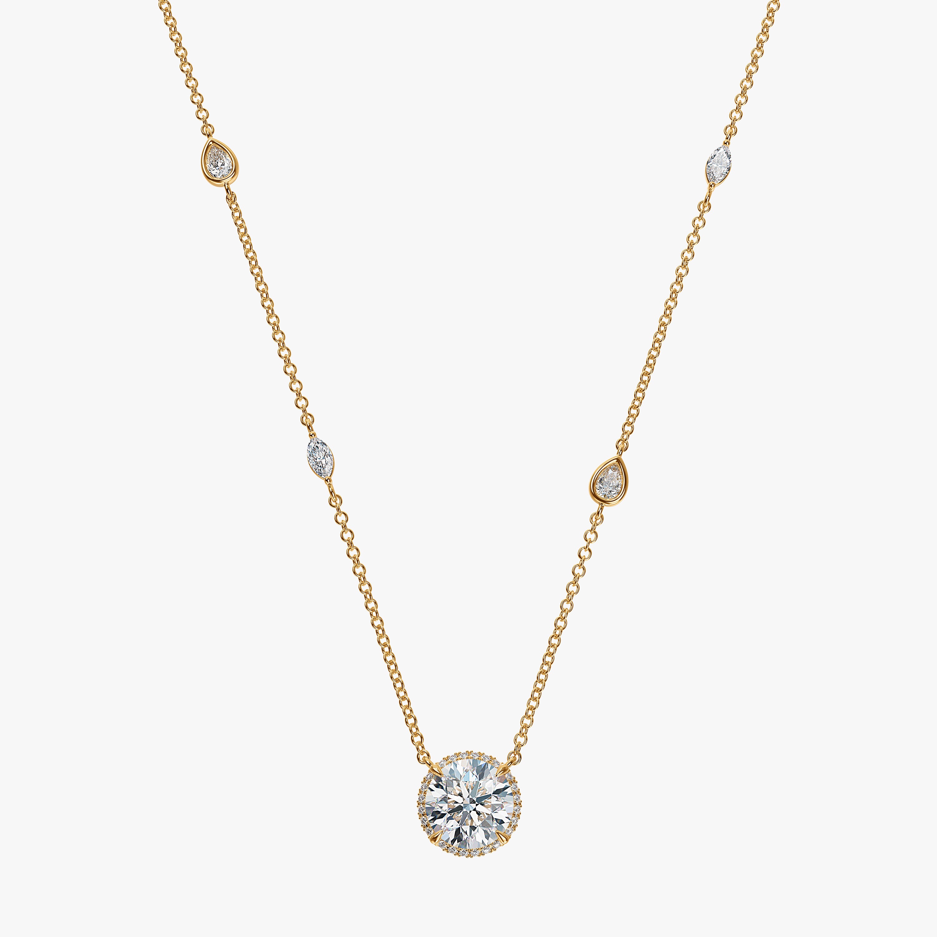Crafted in 18K recycled yellow gold, this By the Yard Invisible Halo Diamond Necklace from the Eclat Collection features a 1.70 CT SCS-007 Certified Sustainability Rated ALTR Lab Grown Diamond Solitaire encircled by a micro pavé halo, suspended from diamond station cable chain.