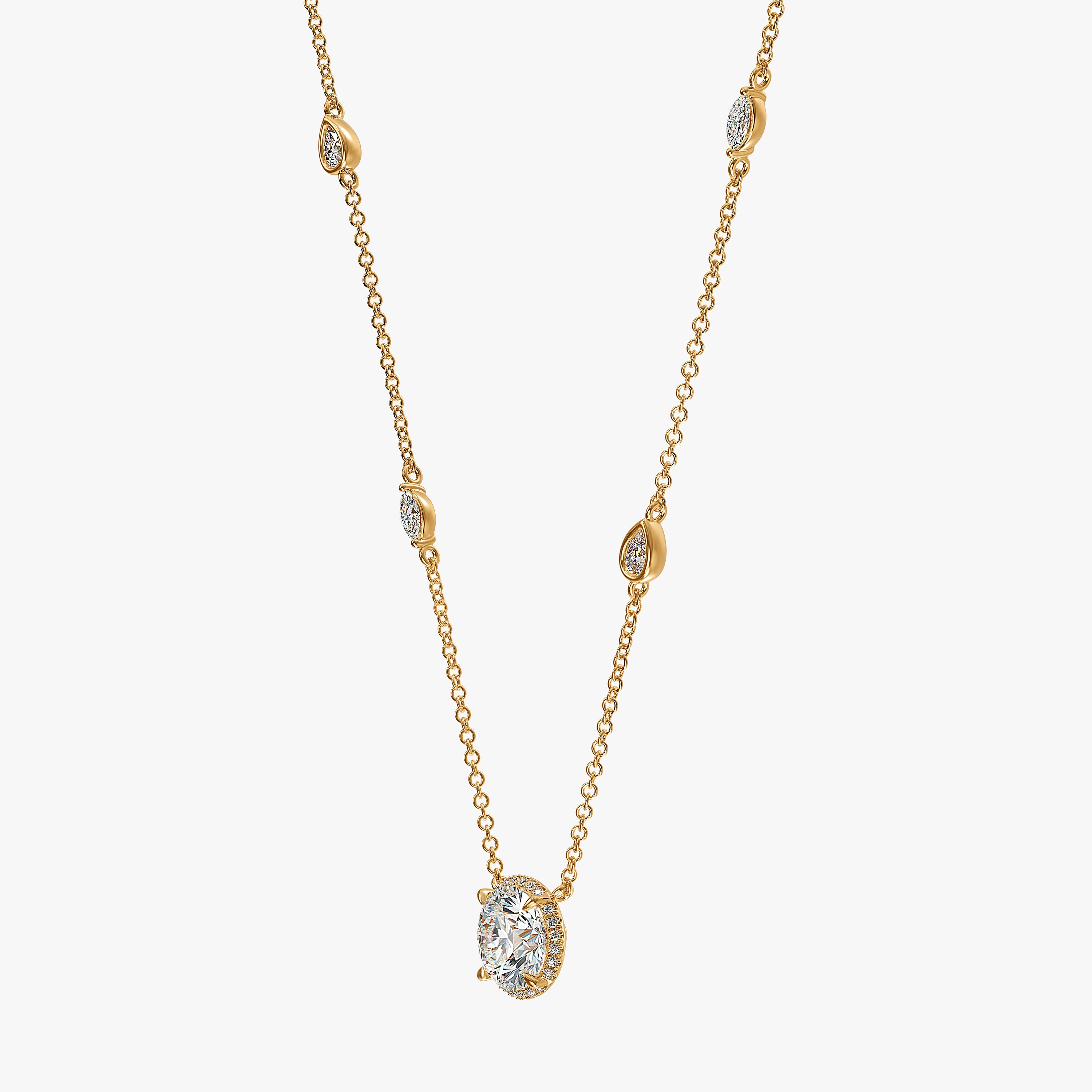 The micro pave hidden halo enhances the pear-shaped solitaire, boosting its brilliance and sparkle while the adjustable cable chain boasts bezel-set pear-shaped diamonds evenly spaced along its length.
