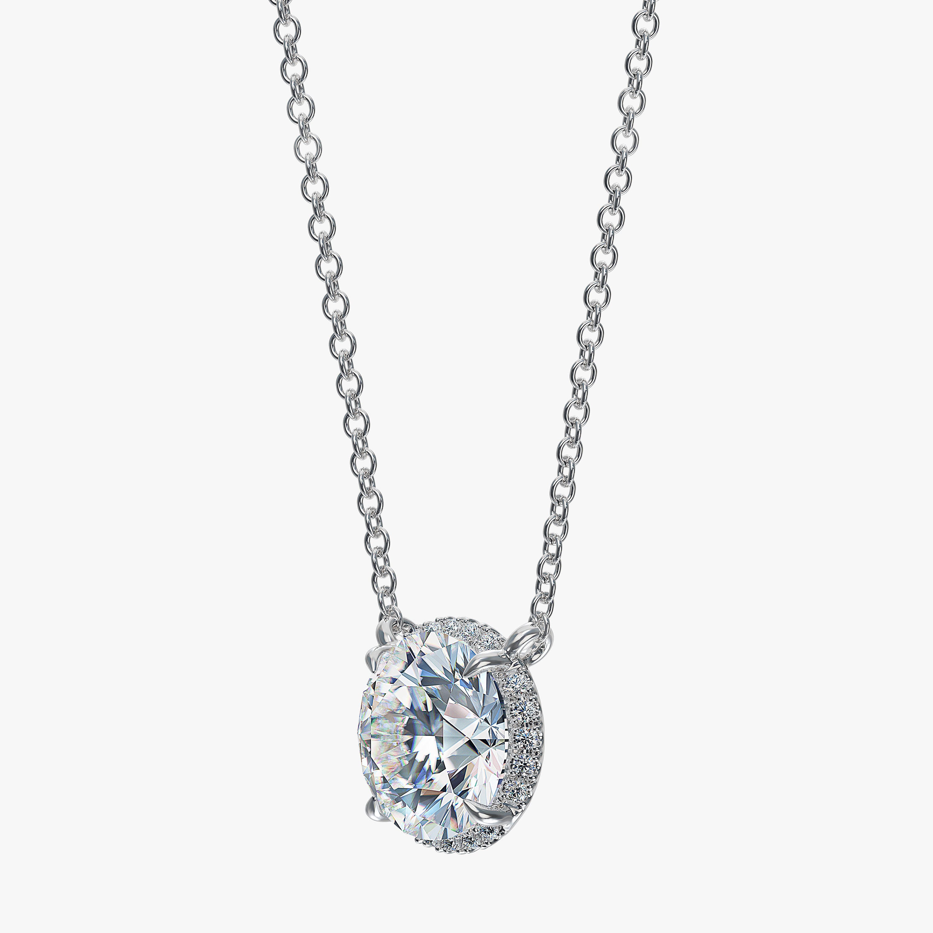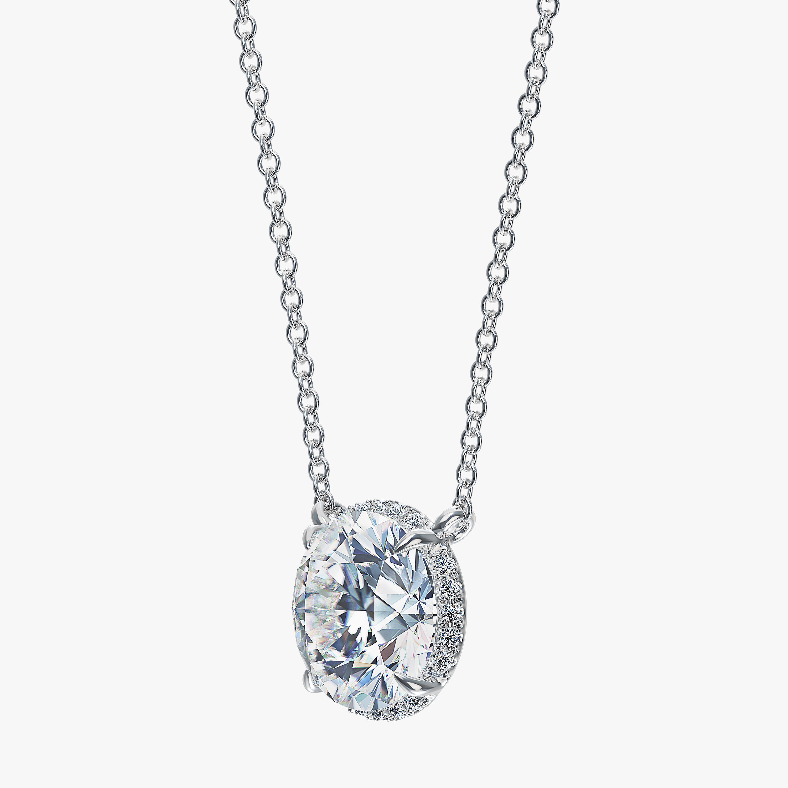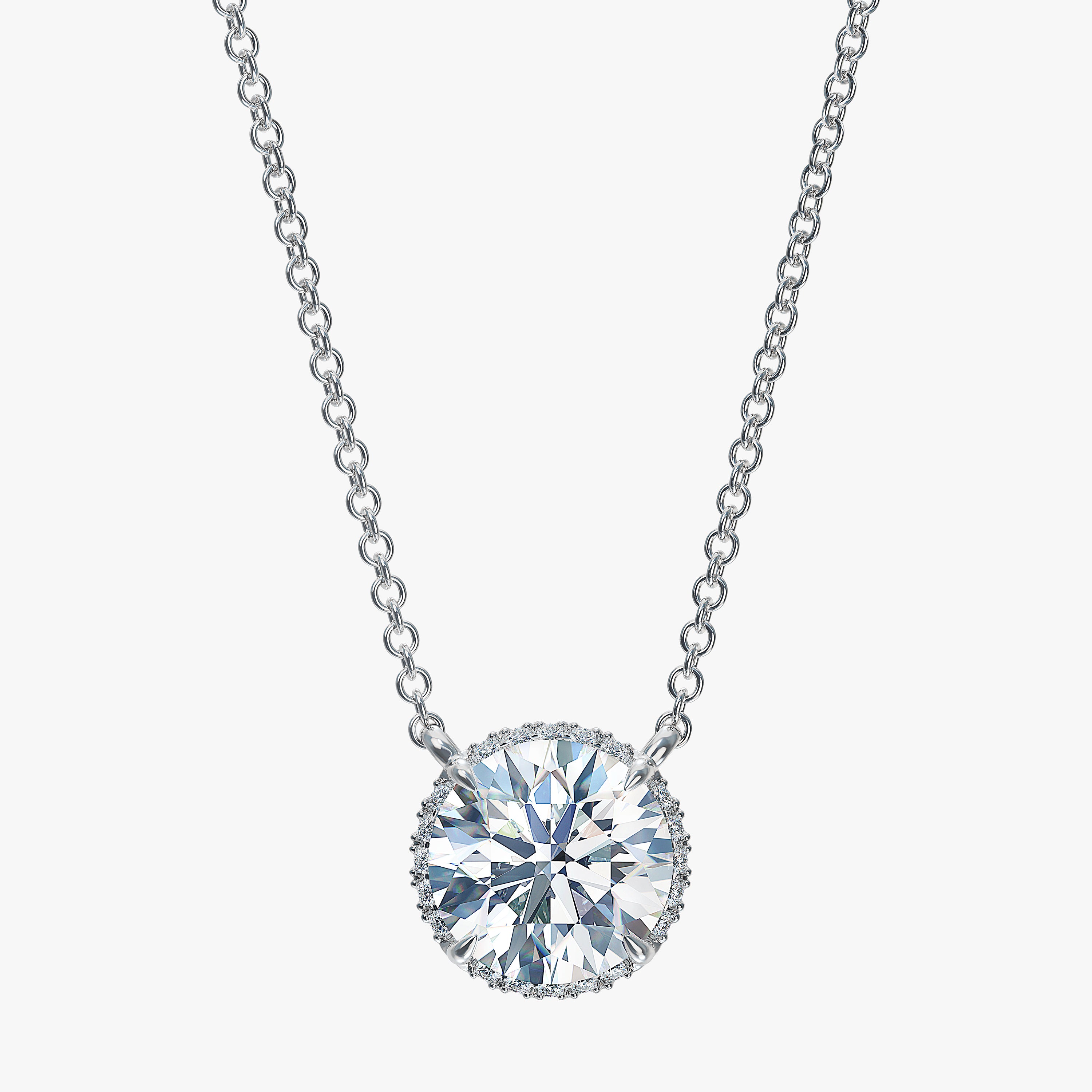 Celebrating the halo effect, this necklace elevates the center diamond with a halo of smaller diamonds crafted to maximize the play of light.